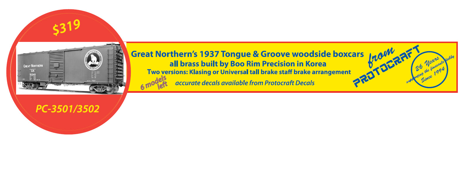 Protocraft’s all-brass model of Great Northern’s 1937-1942 Tongue & Groove wood double-sheathed boxcars encompasses 4 versions