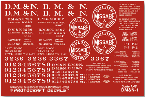 ![]() In 1900, at the turn of the century,two main railroads were supplying iron ore to the growing steel industry in Pennsylvania: the DM&N - Duluth, Missabe & Northern; and the D&IR - Duluth and Iron Range. Prior to that in 1884 both the DM&N and the D&IR came under control of John D. Rockefeller, and in 1901, under ownership of Carnegie Steel. Cost savings resulted in a merger of the two roads as DM&N. In 1937, the DM&N and it’s associated roads were consolidated and renamed the Duluth, Missabe and Iron Range. (DM&IR) While the preponderance of rolling stock were steel ore cars, (12,088 in 1946) the DM&N had a need for refrigerator cars, boxcars and some flatcars and even some oil cars. The DM&N received its first 50, 40’ 40-ton boxcars in 1906 from Western Steel and Car Co. as Class P, and given series numbers 3100-3149. This series had an inside height of 8‘-4” with a capacity of 2,730 cubic ft. In 1907 an order of 100, 40-ton, 42’ double-sheathed steel under-frame boxcars from Standard Steel Car Co, classed as P1 and assigned series numbers 3150-3249. Cubic foot capacity was 2,755 with an inside height of 8‘-1“. In 1916 the cars were rebuilt at DM&N’s Proctor, Minnesota shops by replacing roofs with Murphy steel radical roofs and Murphy 7/7 reverse corrugated steel ends. Cars had a 6’-7” door opening and installed ‘puller tabs’ (equivalent to roping staples) at the left end only of each side. Five of these cars, (3350-3154) were rebuilt with double-doors for automobile loading. See 3150 over. Some cars in this series were still in revenue service up to 1967. A very close 1/4“ scale injection molded model kit of this car is by San Juan Car Company in Duango, Co - kit #122 The next group of 40’, 40-ton boxcars were 100 single-sheathed boxcars built by American Car & Foundry under Lot 9601, as Class P2 and delivered in September 1923. These were assigned series numbers of 3300-3399 and had a 9’-2” inside height to accommodate 3,153 cu. ft . Two hundred and fifty of both series of these cars had a sill step installed just under the opening of the door for easier access during LCL service. (see photo of 3236 above and 3350 over) There were cars in this series of cars still in revenue service up to 1973. All had the puller tabs at the left end. Decal set designed and created at Protocraft Decals