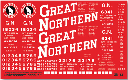 ![]() Late 1950’s lettering scheme featuring the road name on the right side in large slant serif lettering and a smaller 42” herald on the left side. Between 1956 and 1969, the GN began a repainting program for thousands of cars in much brighter colors, - a vermilion red with mineral red trucks, slanted 15”/10“ serif-ed lettering design with a 36” black and white herald. Decal set designed and created at Protocraft Decals ![]() ![]() Background color shown above is not included in decal sheet |