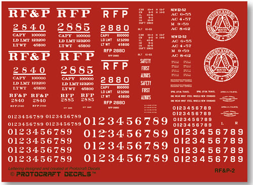 ![]() The Richmond, Fredericksburg & Potomac Railroad was established in February 1834. With 113 miles of track the railroad linked Washington D.C. with Richmond, Virginia, but with this strategic location it connected all the Class 1 roads such as the C&O, B&O, Southern, Pennsylvania, Seaboard and Atlantic Coast Line into Washington, D.C. and was a vital link to the Capital. In 1919, the RF&P acquired 350 USRA single-sheathed boxcars from AC&F and 150 with subsidiary Washington Southern. By 1952, there were just 17 USRA boxcars in remining in service, so in December, 1952, the RFP received 100 P S-1’s from Pullman-Standard under Lot 8042. These were assigned road numbers as Series 2801-2900. ![]() ![]() Background color shown above is not included in decal sheet |