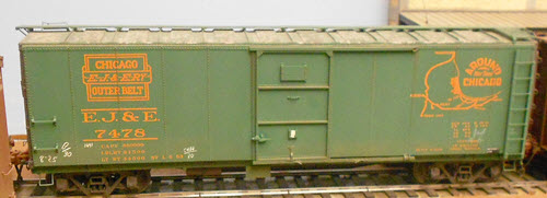 In August of 1919, the EJ&E received 500 Class USRA double-sheathed 40-ton boxcars from AC&F under Lot 8572, and assigned road numbers as Series 7300-7799. In 1936/1937, 450 of these cars remaining in service were rebuilt with steel sides and Murphy Riveted all-steel roofs (this resulted in an increased inside height from 9’-0” to 9’-2”). AB brakes with Miner power hand brake assemblies replaced the KC brake systems and an AB valve protection steel plate was installed under the door.