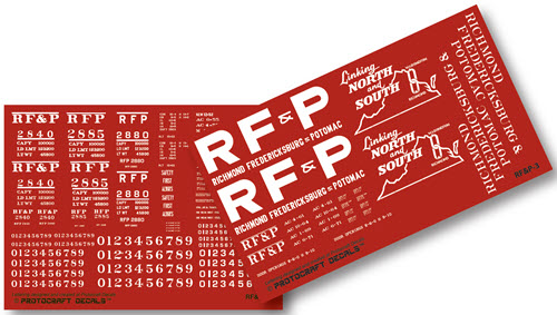 ![]() The Richmond, Fredericksburg & Potomac Railroad was established in February 1834. With 113 miles of track the railroad linked Washington D.C. with Richmond, Virginia, but with this strategic location it connected all the Class 1 roads such as the C&O, B&O, Southern, Pennsylvania, Seaboard and Atlantic Coast Line into Washington, D.C. and was a vital link to the Capital. In 1919, the RF&P acquired 350 USRA single-sheathed boxcars from AC&F and 150 with subsidiary Washington Southern. By 1952, there were just 17 USRA boxcars in remining in service, so in December, 1952, the RFP ordered and received 100 P S-1’s from Pullman-Standard under Lot 8042. These were assigned road numbers ![]() ![]() Background color shown above is not included in decal sheet |