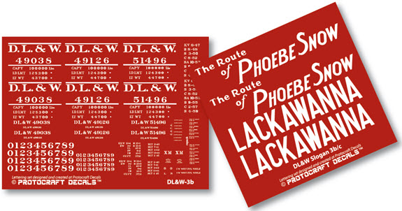 Paint & Lettering: Cars were painted with DL&H freight car brown. Underframe coated with black car cement. Beginning with the 1942 built Series 51000-51399, the DL&W introduced slogan advertising for clean steam engine exhaust with a ctional character “PHOEOE SNOW” : decal set DL&W-3a, and in 1949, named their crack passenger train PHOEBE SNOW, an 8 hour run between Hoboken, New Jersey and Bualo, NY, on the right side of the cars. Later in 1944 with Series 51400-51999, the slogan remained but the road name was increased in size and moved to the left side of the car over the reporting marks - DL&W-3b; and for 1955 Gothic reporting marks see decal set DL&W-3c.