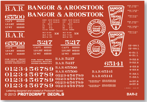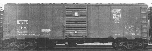 Initially delivered with BANGOR & AROOSTOOK spelled out, in August 1949, the cars went through a repaint schedule that employed the new 'shield' monogram. In 1948, the round medallion was used, but was soon dropped and the cars were repainted again with the 'shield' monogram. In the mid-1950's many of these cars were repainted with the red, white and blue banner "STATE OF MAINE PRODUCTS scheme.