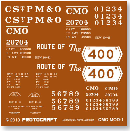 ![]() In October of 1941, the CMO took delivery of 700 Modifed 1937 AAR design box cars built by AC&F, Lot #2255. These cars were assigned road numbers 20000-20048, 20050-20398 and 20400 thru 21398. All had Viking roofs. The cars were painted boxcar red-brown (I part Floquil #74 and 1 part Floquil 186) Underbody and truck side frames painted black car cement. Wheels were unpainted and allowed to rust and gather a coating of axle grease and road dust. A good representation of this patina is to paint the wheels and axles with a 50% mixture of Floquil Grimey Black and 50% Floquil Zinc Chromate Primer. Lettering designed and sized at Protocraft Decals with artwork by Norm Buckhart ![]() Background color shown above is not included in decal sheet |
