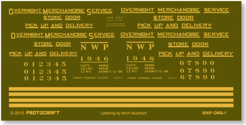 ![]() The Northwestern Paci.c took delivery of 100 USRA double-sheathed box cars from Standard Steel Car Company in November of 1919. Assigned road numbers 1900-1999 and painted box car red, the majority of these cars saw interchange service into the late 1950’s. In 1939, 22 of these cars were assigned to overnight express service on the road’s Eureka-Tiburon night passenger trains. (note the lack of interchange required data). This lettering scheme was in Dulux gold (yellow) on an all passenger dark green car. The color of the roof, underbody and truck sideframes was probably black car cement. Speci.c road numbers for this service are compiled from a list by Fred Stindt: 1900, 1904, 1906, 1909, 1910, 1916, 1917, 1939, 1943, 1946, 1947, 1951, 1952, 1953, 1960, 1964, 1969, 1984, 1986,1989, 1992 and 1997. In 1940 the banner paint scheme on an all black car was applied. (see Protocraft decal sheet NWP ON-1) Decal design and layout at Protocraft Decal Line. Artwork by Norm Buckhart.