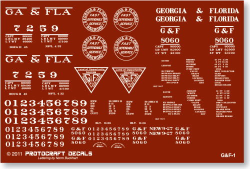 The Georgia & Florida Railroad was formed in 1906 and ran on 297 miles of track between Albany, Georgia and Madison, Florida. It’s rolling stock was sparce but in 1926 the G&F took delivery of 250 boxcars from AC&F of the Fowler design, and numbered them 7246-7500. In 1927, another 100 cars were delivered and numbered 8000-8099. These were the road’s only cars used in interchange service and ran up through the 1950’s. In 1963 the G&F was acquired by the Southern Railway which later merged it into it’s subsidiary, Central of Georgia in 1971. Cars were painted box car red with white lettering, black underbody and truck side frames. San Juan Car Co.’s Fowler-design model #119 can be used to model these cars. Decal sheet designed and sized at Protocraft Decals with artwork and lettering by Norm Buckhart.