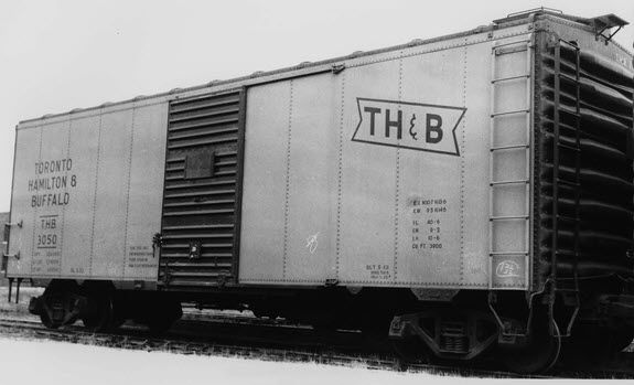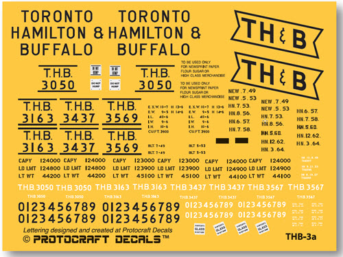 The TH&B was a subsidairy of the Canadian Pacific and New York Central. Based in Hamilton, Ontario, the TH&B never reached Buffalo or Toronto, and was wholly absorbed into the CP in 1977. Between May and August 1949, the National Steel Co of Canada built 300 steel boxcars to replace the aging USRA boxcars bought from the NYC in 1940. These were assigned road numbers as Series 3000-3299. In 1953, the TH&B received a second order of 300 cars of the same design as Series 3300-3599. Series 3000-3299, originally painted tuscan red with all white stenciling in 1949, were repainted in the new yellow and black scheme starting in 1952. (note: in 1955, a second yellow and black lettering scheme was introduced and applied to both series as the cars came in for repainting and heavy servicing. - see Protocraft Decal sheet TH&B-3b)