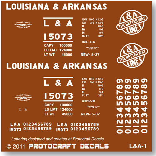 ![]() In May, 1937, the L&A was able to add to an order of 1000 1932 ARA box cars being built for the Seaboard Railway by Pullman- Standard, Lot 5551A, and receive the additional 150 cars from that lot. The L&A assigned road numbers 15000-15149. In 1939 the L&A was absorbed into the Kansas City Southern. The cars kept the same road numbers but the “Better Way” medallion was replaced with the KCS herald during regular repaint schedules. ![]() Background color shown above is not included in decal sheet |