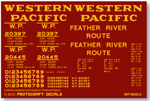 ![]() The Western Pacific took delivery of 350 Modified 1937 AAR box cars in January, 1945. Built by Mt. Vernon Car Co in Lot #9722, the cars were assigned road numbers 20201-20550. Car body painted red-brown (1 part Floquil #74 + 1 part Floquil #186) all lettering and slogans in Armour yellow. Underbody and truck side frames painted with black car cement. Wheels were unpainted and allowed to rust and gather a coating of axle grease. Lettering designed and created at Protocraft Decals ![]() ![]() Background color shown above is not included in decal sheet |