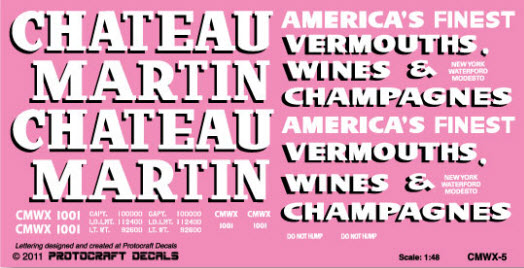 ![]() The Chateau Martin wine cars were mostly former 42’ express milk cars and were owned by the Commodities Car Company, Inc. of New York City (reporting marks CMWX). The Chateau Martin brand was owned by Eastern Wine Corporation of New York. Martin had a total of 79 of these cars. Interestingly enough, they did own one 1944 AAR steel boxcar: #1001. This lettering set is designed for that car. The cars were painted in a light burgundy - we suggest Pantone #224C or #225C, but the color was subject to fading and many shades lighter would depict the cars during various stages of their useful life. Decal set designed and created at Protocraft Decals. ![]() ![]() Background color shown above is not included in decal sheet |