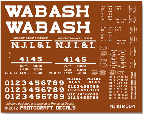 ![]() The NJI&I took delivery of 50 Modified 1937 AAR box cars in March of 1944. Built in Wabash shops as series 4100-4149. These cars had the distinctive straight sill tabs between bolsters. Cars were painted in Wabash red-oxide (1 part Floquil #175 and 1 part Floquil #186) Underbody and truck side frames painted black car cement. Wheels were unpainted and allowed to rust and gather a coating of axle grease. Lettering designed and created at Protocraft Decals ![]() Background color shown above is not included in decal sheet |