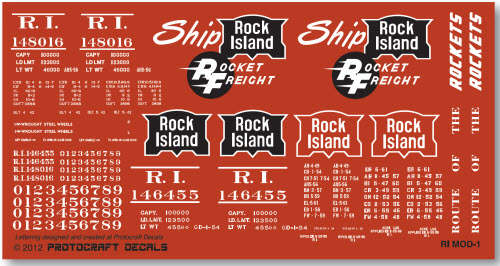 ![]() Between February 1940 and February 1945, the RI took delivery of 4,050 Modified 1937 AAR design box cars from Pressed Steel Corp, Lot 4560-F, Series 14500-149049. (An additional 50 cars were delivered in 1941 with Allied Express trucks for passenger service, Series 20000-20049) See over for the as-delivered lettering scheme. Cars were painted a red-brown (1 part Floquil #74 an 1 part Floquil #186) Underbody and truck side frames coated with black car cement. Wheel unpainted and allowed to gather road grime an axle grease. Lettering designed and created at Protocraft Decals. ![]() ![]() Background color shown above is not included in decal sheet |