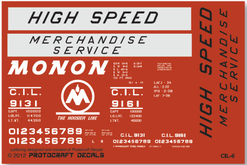 ![]() In October 1941, the MONON received 150 1937 AAR 10'-0" IH boxcars from Pullman-Standard, Lot 5667B, Series 9150-9449; and again in April 1942, 300 cars from Pullman-Standard, Lot 5707, Series 9500-9999 (Note: after 1960, the reporting marks were changed to MON, keeping the same series numbers). Between May 1952 and January 1957, these cars were repainted with the light gray Hoosier Line banner across the top of the car with black lettering (see Protocraft Decals CIL-4 for this paint and lettering scheme). A small number of these cars were selected, probably less than 10 and seemingly at random, for LCL service. Photographs are rare. The light gray banner was relettered to read "HIGH SPEED MERCHANDISE SERVICE". This was in response to rival PRR and B&O LCL service competition. Lettering and artwork designed and sized at Protocraft Decals.