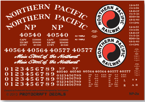 ![]() In 1937 the N.P took delivery of 520 wood sided 1937 AAR design boxcars, much like the Great Northern’s. Built by Pacic Car & Foundry in Renton, WA, the cars were assigned Series 9480-9999. In the mid-1950’s a majority of these cars were rebuilt with 55-ton trucks and renumbered as Series 40500-40917, many were still in revenue service in the mid-1970’s. Repainting included the post 1955 5’ monad medallion with NORTHERN PACIFIC RAILWAY, periods and 1’ reporting marks lines were dropped. This decal sheet is designed for this scheme. Decal sheet created at Protocraft Decals with artwork by Ted Culotta . Paint & Lettering: Cars were painted NP mineral brown. Tru-Color #193. Lettering is all white stencil paste with the red and black monan. ![]() Background color shown above is not included in decal sheet |