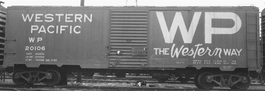 The Western Pacic took delivery of 350 Modied 1937 AAR box cars in January, 1945. Built by Mt. Vernon Car Co, Lot #9722, Series 20201-20550. ![]() Background color shown above is not included in decal sheet |