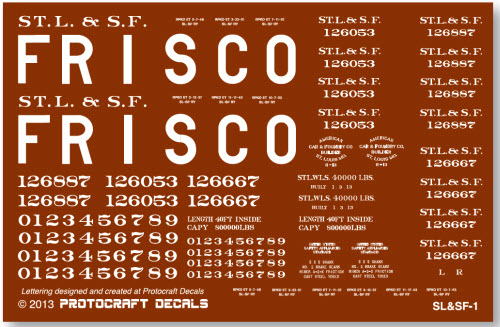 ![]() In 1912 the Frisco purchased 1000 “sawtooth” boxcars from AC&F, Series 126000-126999. These cars remained in revenue service with 8 still on the roster in1953. Paint & Lettering: Cars were painted entirely boxcar red. TCP-243-2. Lettering was all white stencil paste ![]() ![]() Background color shown above is not included in decal sheet |