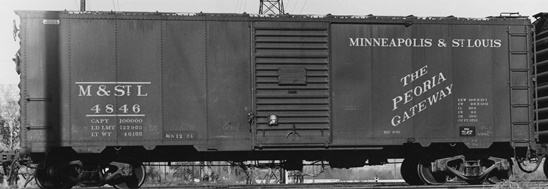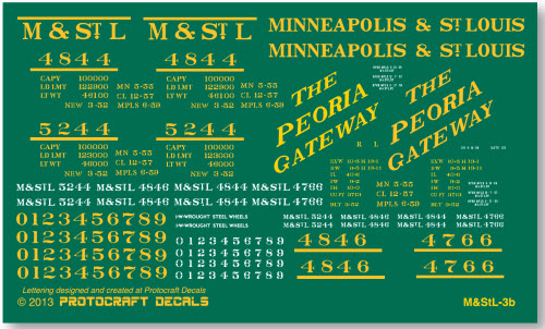 In April 1952, the M&StL received 700 boxcars of 10’-0” IH and 3/4 IDN ends, basically a 1944 AAR design but with a 10’-0” inside height. Built by General American Transportation Corp., Lot 8026, Series 4000-5398 (even numbers only) These cars were delivered painted with green sides (DuPont #89-8127 Vorhauer Green Delux Enamel “Devin’s Green”), black ends, roof, underframe and truck sideframes. Wheels unpainted. Side stenciling was yellow, which faded in a fairly short time period, end reporting marks in white stencil paste. Most repaints by M&StL shops had the roofs green as well. There are photos showing that some cars later on had red doors, but there is no evidence that the red doors indicated that they were intended for any speci.c use, just replacement doors from the 53000 series. ![]() ![]() Background color shown above is not included in decal sheet |