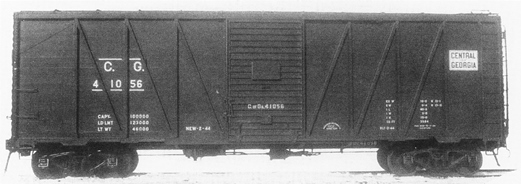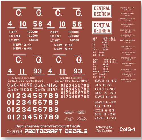 ![]() In February 1944, the Central of Georgia received 100 War Emergency design 10’-0” IH boxcars from AC&F as Lot 2491, Series 41000-41099. In May 1944, the CofG received an additional 250 War Emergency boxcars from Pullman-Standard’s Bessemer, Alabama plant as Lot 5761, Series 41100-41349. Paint & Lettering: The cars received di.erent paint but of the same shade of color. Series 41000-41099 received Pittsburgh Carhide Synthetic brown: TCP-93) on sides, while the ends, roof,underframe and trucks were coated with black car cement. Series 41100-41199 received a coat of DuPont #474-916 Brown paint; and Series 41200-41349 received a coat of PPG Carhide Brown. Again only the sides were painted these colors (TCP-93) while the ends, roof, underbody and trucks were coated with black car cement. Galvanized running boards and wheels were unpainted. ![]() ![]() Background color shown above is not included in decal sheet |