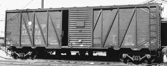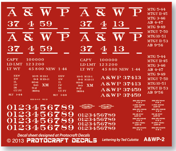 ![]() In January 1944 the Georgia Railway system received 225 10’-0” IH wood-sheathed, composite boxcars, a design approved by the War Production Board that saved valuable steel, from Pullman-Standard Car Co, as Lot 5753. The cars were further allocated within the Georgia system with 60 of these cars going to the A&WP as Series 37400-37459. Paint & Lettering: Car sides, ends and underframes were painted with PPG Carhide #N-4780 RR Standard Paint. Paint chips make this color a match for Group III medium red-brown: TCP-903. Roof and truck side frames coated with Durite black car cement. Lettering is Snolite White stencil paste. For a more in-depth study of the War Emergency Boxcars, see RP CYC Vol 19, pages 1-30, by Pat Wider and Ed Hawkins. ![]() ![]() Background color shown above is not included in decal sheet |