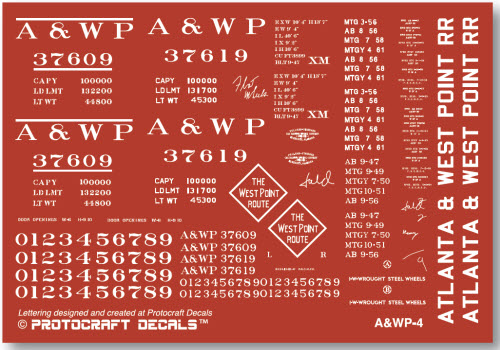 ![]() The A&WP was part of the “West Point Route” under parent Georgia Railroad which included the Western of Alabama Railroad, all three operating as one railroad. In September 1947, the Georgia Railroad system received 150, 1944 AAR design 10’-6” IH boxcars, allocating 50 cars each to the Georgia, A&WP and WofA. A&WP received 50 cars as Series 37600-37649. Paint & Lettering: Car painted all boxcar red, TCP-923, underbody and trucks, all black, wheels unpainted. Decal sheet designed and sized at Protocraft Decals - Lettering by Ted Culotta ![]() ![]() Background color shown above is not included in decal sheet |