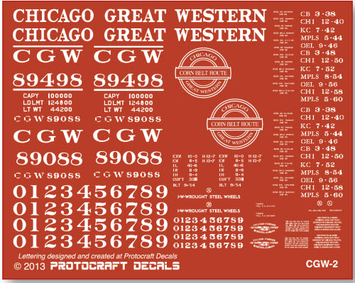 ![]() In September 1934, the Chicago Great Western took delivery of 500 boxcars of the 1932 ARA 9’-4” IH design, from Pullman-Standard under Lot 5500, assigned as Series 89000-89998 (even numbers only) #89498 above displays it’s as-delivered paint and lettering scheme. As the cars were repainted in the 1940’s or so, the Corn Belt Route medallion was dropped and 1” lines were added to the reporting marks. In 1965, after 36 years, 206 were still in revenure service, but by 1970, when the CGW was taken over by the C&NW, only 25 remained. Decal set designed and created at Protocraft Decals ![]() Background color shown above is not included in decal sheet |