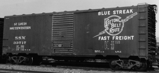 In March of 1941, the SSW took delivery of 200 Modied 1937 AAR design box cars. These cars were built in SSW’s shops and assigned series numbers 33500- 33699. In December 1943, an additional 150 cars were built in SSW shops as Series 33700-33849. ![]() ![]() Background color shown above is not included in decal sheet |