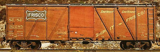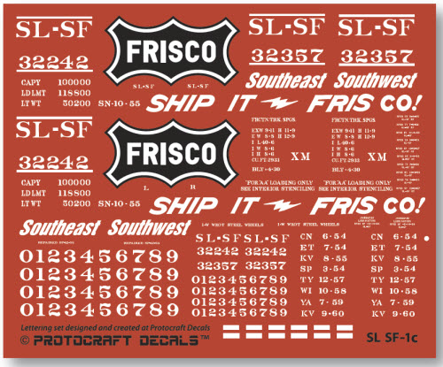 Between 1925 and 1930, the FRISCO received 6,500 Howe Truss design boxcars. These cars were wood sided single-sheathed with an inside height of 8’-6”. In 1950 many were rebuilt with steel side sheathing. This lettering set was designed forthese rebuilt cars. ![]() ![]() Background color shown above is not included in decal sheet |