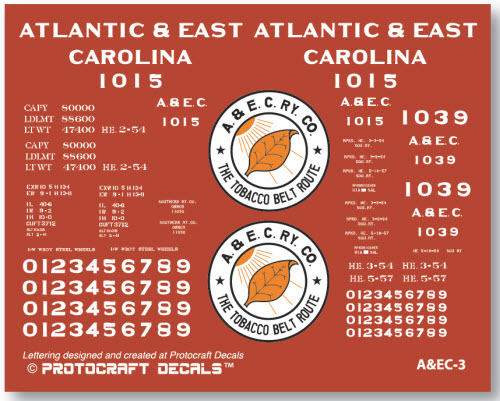 ![]() Between February and March 1954, the A&EC received 100 ex-Southern 1937 AAR boxcars, and assigned Series 1000-1099 to them. These were a random mix of both the early 1938 square corner cars and 1941 round (W) corner cars. These can be distingushed by the build dates of 9-11, 1938 and 2-3, 1941. All cars, including the 900 Series, were upgraded with Morton running boards. In April 1957 and January 1958, the A&EC received an additional 100 former Southern RR 1937 AAR boxcars, and assigned them as Series 900-999. Again refer to the build date to determine them as square or round corner cars. Most of these cars saw revenue service well into the 1960’s. Decal set designed and created at Protocraft Decals ![]() ![]() Background color shown above is not included in decal sheet |