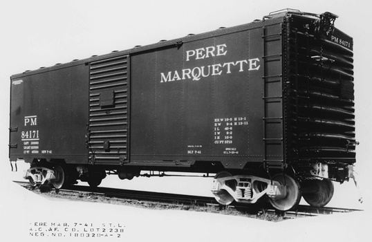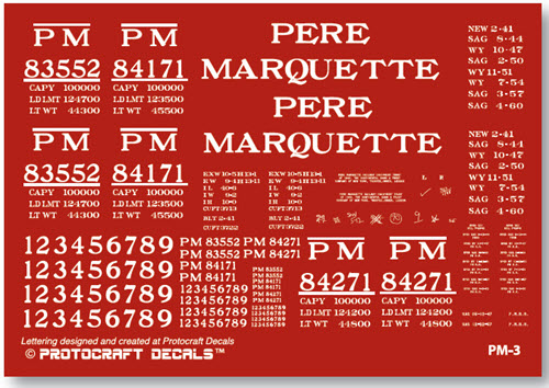 Between January and September, 1941, the PM received 650 1937 AAR design boxcars. The first 150 were from General American Transpor- tation Corp, Lot 2841, Series 83500-83649 - Youngstown doors. In January, Pullman-Standard delivered another 150 cars, Lot 5647, Series 83650-83799, with 7-panel Superior doors. Also in January, an additonal 200 cars from AC&F, Lot 2128, Series 83800-83999, with Youngstown doors. In July, 100 cars from AC&F, Lot 2238, Series 84100-84199, also with Youngstown doors. In June, GATC delivered 100 cars in Lot 2839, Series 84200-84299, with Youngstown doors. And finally, in September, 100 cars from Pullman-Standard, Lot 5667A, Series 84300-84399. ![]() ![]() Background color shown above is not included in decal sheet |