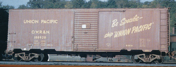 These cars closely followed U.P.’s first all-steel design of the one-o B-50-18 test car - UP 182500. Both B-50-19 and B-50-21’s were constructed with conventional side construction and did not employ the light-weight alternate rivet side design while the B-50-22 through B-50-27 cars did. From June 1939 to November 1939, the U.P. received 1,200 class B-50-24 cars as Series 187000-188198, the O.W.R.&N. received 700 cars as Series 188300-188999 as B-50-24 class built in the UP’s Albina shops. In 1940, 1,500 B-50-27 cars were divided between O.W.R.&N. 189000-189299; O.S.L. 189400-189899 built in UP’s Albina shops; and U.P. 19000-190699 built in UP’s Grand Island and Omaha shops.