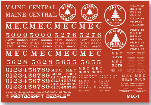 In the mid-1940’s a new round emblem appeared with the pine tree and the word CENTRAL horizontally under the tree. This was short lived and after 1947 during subsquent routine matenance this was painted over and replaced with the simpler MAINE CENTRAL around inside the circle. ![]() ![]() ![]() Background color shown above is not included in decal sheet |