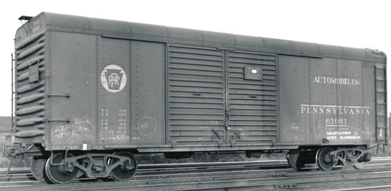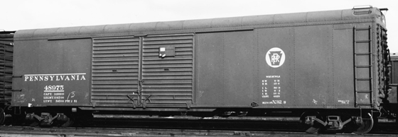 In the middle of the depression in 1934, the Pennsylvania began a massive car building program in it’s Altoona, PA shops. Over 12,500 cars of this design were built by the end of 1936. The round roof design was adopted to achieve the maximum cubic foot capacity loading and still clear tunnel restrictions, and became their new and distinctive PRR standard boxcar. Two basic roofs were adopted - one ush to the sides and the other with a 2” setback at the top of the roof. Cars were both 40‘ and 50’ in length and came with either single or double doors with 6‘ and 12’-1-1/2” or 14‘-6” openings respectivly. During one period between March and April 1936, 3,051 of these cars were contracted out between builders AC&F, BSC, GATC, GSC and PSC. In 1939 and through 1940, the PRR modied the roofs of 690, 40’ double-door cars with a distinctive extended roof to accommodate jeep shipments. These were designated as X31F and classifed XAR.