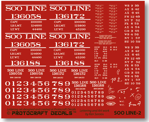 ![]() In October, 1936, the SOO received 600 cars of the 1932 ARA 9’-4” IH design from Pullman-Standard Car Company. The first 500 went to parent MSt.P&SSM, Lot 5534, as Series 41800-42798 (even numbers only); and subsidiary Wisconsin Central received an additional 100 cars under the same lot number, and assigned Series 135800-135998 (even numbers only). Paint & Lettering: As delivered the cars were painted SOO’s oxide red: TCP-243 . Ends, underframe and truck side frames coated with black car cement. Between 1936 and 1945 the paint and lettering scheme displayed the white parallelogram emblem with the black background. See example below for decal placement. Beginning in 1949 and through 1951 the black background was removed and the parallelogram was with white outlines only. This applies to all repaints during this period. Beginning in 1951, the SOO went to the 48“ high billboard lettering and the parallelogram was discontinued. Footnote: The original Wisconsin Central (1893-1909) was leased by the MSt.P&SSM in 1909. The word ‘Sault” of Minneapolis, St. Paul & Sault Ste. Marie, is pronounced “soo”, hence the road’s nickname which later became it’s legal name. This lettering set was designed and created at Protocraft Decals from artwork by Ken Soroos ![]() ![]() Background color shown above is not included in decal sheet |