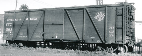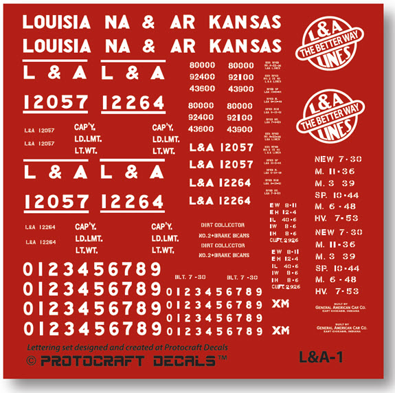 ![]() The Louisiana & Arkansas Railroad, incorporated in 1898, operated on 332 miles of track between Arkansas and Shreveport, Louisiana, New Orleans and Dallas, Texas. In 1902, it was reorganized as the Louisiana & Arkansas Railway, now with 608 miles of trackage. In 1939, the L&A merged with the KCS, total trackage increased to 810 miles, and was best known for it’s premier passenger train the Shreveporter and later, the Hustler. In July of 1930, the L&A took delivery of 300, 40-ton boxcars of the Howe Truss design. Built by General American Car Company, the cars were assigned road numbers as Series 12000-12299. The cars came with 2-section reverse 4/4 Dreadnaught ends, Hutchins radial roofs, and 6’ Creco doors. 35 were still in revenue service in 1958, but by 1965, all were gone except for some relegated to maintenance of way. Paint & Lettering: Cars painted with freight car brown. Decal set designed and created at Protocraft Decals
