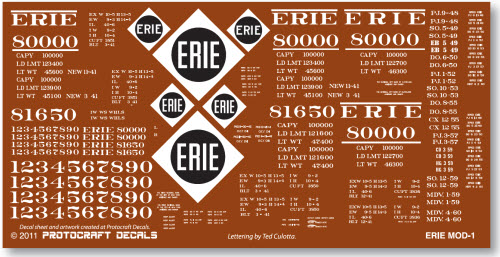 ![]() In 1941 the ERIE received 1,100 Modied 1937 AAR design box cars of ERIE’s 10’-4” IH in 3 lots: American Car & Foundry, 200 cars, Lot 2152, Series 80000-80199; Magor Car Corp, 100 cars, Lot P9760, Series 80200-80299; and Pullman-Standard, 800 cars, Lot 5683, Series 81000-81799. The cars were delivered with the 34” black and white monogram, painted box car brown (Floquil #25), door placards, underbody and truck sideframes coated with black car cement. Wheels were unpainted and allowed to rust and gather a coating of axle grease. Decal sheet and artwork created at Protocraft Decals. Lettering by Ted Culotta. Car 80000 below has been repainted in January of 1952 at Port Jervis, NY, and displays the 1947 black and white 72” monogram with a dierent data display. ![]() ![]() Background color shown above is not included in decal sheet |