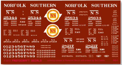 The Norfolk Southern Railway Company took delivery of 500 1932 ARA Standard 9’-3” IH boxcars between November 1935 and January, 1936. Built by Pullman-Standard, Lot 5513, Class XM2, assigned as Series 25000-25499. ![]() Background color shown above is not included in decal sheet |