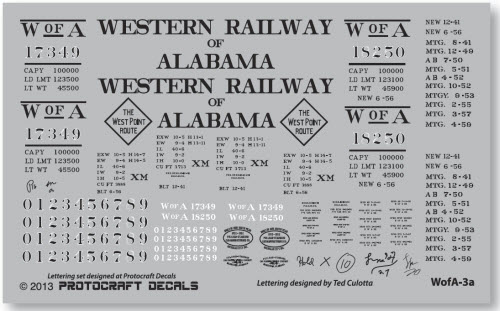 ![]() The WofA was part of the “West Point Route” under parent Georgia Railroad which included the Atlanta & West Point Railroad, all three operating as one railroad. In December 1941, the WofA received 60 1937 AAR design boxcars numbered Series 17300-17359, as part of a 100 car order under Lot 5685, with 40 cars going to sibling A&WP as Series 37300-37339. Paint & Lettering: Sides painted aluminum. Doors, door tracks, side ladders and the portion of the side under the side ladders., car ends, roof, underbody and trucks, all black. Decal sheet designed and sized at Protocraft Decals - Lettering by Ted Culotta In June 1956, the Wof A received 17 boxcars of P-S 1 design under Lot 8284D This Series was built of aluminum sides and roof and only the black ends and underframe were painted) (note: sister road A&WP received 33 cars from the same lot, as Series 38000-38032.) Notice the di.erences with the aluminum and black schemes to the earlier 17300 Series above. (See Decal sheet WofA-3b for lettering on earlier P-S 1 cars) ![]() ![]() Background color shown above is not included in decal sheet |