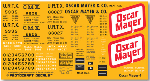 ![]() In March of 1937, the Oscar Mayer leased 20, 37’3” wood refrigerator cars from Union Refrigerator Transit Lines, the meat refrigerator leasing subsidiary of General American Transportation Corporation, owner and builder of the cars. Reporting marks road numbers were Paint & Lettering: Sides painted reefer yellow with mineral red ends and roof. Lettering black stencil paste. Decal set designed and created at Protocraft Decals ![]() ![]() Background color shown above is not included in decal sheet |