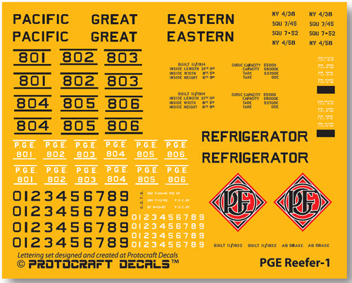 ![]() In 1914, the PGE received the rst three of it’s wood refrigerator cars - 36’ cars, built new by National Steel Car Company of Hamilton, Ontario, and numbered as Series 801-803. In October 1939, the PGE acquired 3 additional, used, 36’ reefers of the truss-rod design, and numbered into 804-806 Series (note: #805 was destroyed in either1945 or 1947, reducing the ‘fleet’ to 5 cars.) Paint & Lettering: Car sides were painted yellow with mineral red ends, roof and fascia. Cars were lettered in all black sans-serif block letters - 9” for the road name and 7” for reporting numbers and “REFRIGERATOR”, after 1945, most likely coinciding with the addtional 3 car acquisition, the new red, blue and black diamond logo was added. Decal set designed and created at Protocraft Decals Note: In 1946, the PGE acquired 20 former NRC 40’ wood refrigerator cars built in 1924. Series were numbered as 808-827 (807 not used for some reason). The PGE went to the new black moose head logo on aluminum-gray color sides and ends with black tar roofs and black car cement underbodies; the colorful diamond was not continued as the cars became quite dirty with snow and slush with constant use. (See decal set PGE Reefer-2 for this later scheme) ![]() ![]() Background color shown above is not included in decal sheet |