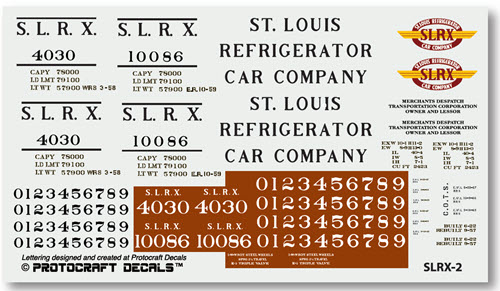 ![]() The St. Louis Refrigerator Car Company purchased used or leased wood refrigerator cars for hauling Anheuser-Busch beer in cases. Some series of cars came with ice hatches and were designated at RS, but many had no ice hatches and were designated as RB. Series for 40’ cars ran from 4000-4899 and 8000-8099. In 1949, the SLRX leased 350 wood refrigerator of 70,000 lbs. capacity from NYC owned Merchants Despatch Transportation Corporation: series ranged from 10000-10399. The SLRX fleet roster now reached 1,484 refrigerator cars as of October 1950. Paint & Lettering: Sides painted white with a mineral red stripe at the lower side as well as top facia board. Ends and roof painted mineral red, with underbody black. Decal set designed and created at Protocraft Decals ![]() ![]() Background color shown above is not included in decal sheet |