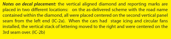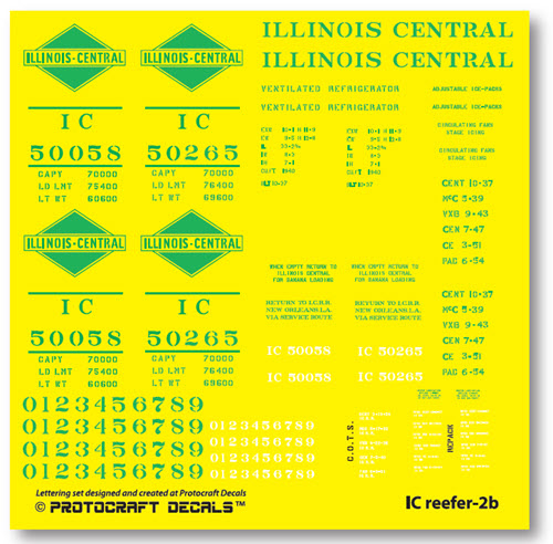 ![]() Two thirds of all bananas consumed in the US were supplied by the United Fruit Co and Standard Fruit & Steamship Line from Central America to the port of New Orleans. The Illinois Central Railroad was the prime mover of bananas and other perishable fruits from the ports of New Orleans all the way to Minnesota via Mississippi, Alabama, Missouri, Tennessee, Illinois, Wisconsin, Iowa and Nebraska. In October1937, the IC received 300 all steel ice reefers from GATC under O.O. 2782 as Series 50000-50299. In the early 1950’s, ice staging circular fans were installed and the updated diamond was applied. Notes on decal placement: the vertical aligned diamond and reporting marks are placed in two different locations: on the as-delivered scheme with the road name contained within the diamond, all were placed centered on the second vertical panel seam from the left end (IC-2a). When the cars had stage icing and circular fans installed, the vertical stack of lettering moved to the right and were centered on the Paint & Lettering: Body color was chrome yellow (IC spec 24-C) ; silver-gray roof and IC green lettering, herald and side sill striping. Beginning in 1950, the new IC herald with the road name extending beyond the diamond (IC 50058 above). Underframe black car cement. ![]() ![]() ![]() Background color shown above is not included in decal sheet |