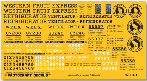 ![]() Western Fruit Express was formed in 1923 as a Great Northern Railway affiliate of the Fruit Growers Express Company. During the 1920’s and 1940’s, the WFE had a fleet of over 7,000 wood cars, the majority of which were built by Haskell & Barker. Paint & Lettering: Sides were painted reefer yellow-orange with mineral red roof and ends; black underbody and trucks. Repaint schemes usually resulted in everything on the sides, including roof edges, ladders and hinges, painted reefer orange- yellow. Side facing goat applied in the 1950’s with sans-serif lettering. (See Protocraft Decal set WFEX-2) Decal set designed and created at Protocraft Decals Based on the artwork of Ted Culotta Printed by Microscale Industries ![]() ![]() Background color shown above is not included in decal sheet |