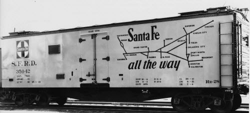 At the end of 1943, periods between S.F.R.D. were dropped for the simple SFRD reporting marks. Cars were painted Santa Fe reefer orange with black car