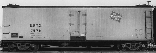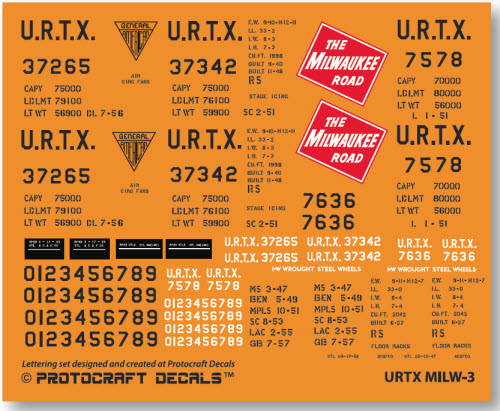 The Milwaulkee Road leased 500 of these center riveted horizontal seam steel refrigerator cars from URTX over a ten year span. Built between 1940 and 1948 by URTX parent, General American Transportation Corp, both 37265 and 37000 are examples of this Series. URTX 37000, the rst in it’s series and built in 1940 is shown with a 1956 repaint scheme (see over), while URTX 37265 above, built in November 1948 displays it’s as- delivered paint scheme painted all over in orange and the builder’s badge just to the left of the door. URTX 37000 has black ends and roof with only the sides in orange. ![]() ![]() Background color shown above is not included in decal sheet |
