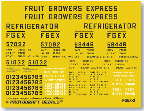 ![]() Fruit Growers Express was formed in 1920 gaining over 4000 wood reefers when separated from Armour & Co as a result of the Federal Traide Commission’s Anti-Trust laws. This series of 40’ wood reefers, 55000-58899, built in 1920, were rebuilt in 1947 in Atlanta and repainted in a sans-serif lettering scheme. Roof and ends painted mineral red with reefer yellow sides. Repaints such as FGEX 57092 frequently involved painting the entire side, including ladders, hinges and toe kick plates in the body paint. While the roof and running boards were painted mineral red, no masking was done to the roof edges and they ended up with the yellow side color. Underbody and trucks coated with black car cement. Decal sheet designed and sized at Protocraft Decals with lettering by Ted Culotta ![]() ![]() Background color shown above is not included in decal sheet |