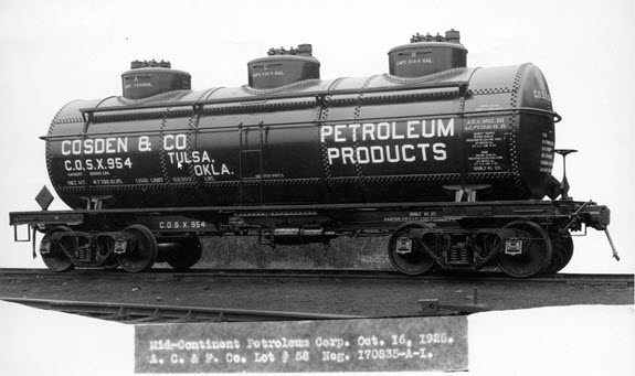 The Cosden Oil & Gas Company was started by Josh Cosden of Tulsa, Oklahoma in 1916. Cosden is credited with establishing Oklahoma as a major oil producing state, building a $35 million dollar oil business within the rst 10 years. Organizing all his enterprises under one umbrella as the Mid-Continent Petroleum Corp: Acquired or merged with Sun Oils in 1955 to form D-X Sunray, Sunray D-X and Sunray Mid-Continent Oil Company. D-X was a brand of Mid-Continent’s “Diamond” and Sonoco gas stations. D-X was introduced in 1933, suggesting an “X” factor or unknown substance that made it’s gasoline superior to others. Stations sold motor oil, kerosene, Diamond gasoline, and an anti-knock compound "Nevr-Nox" as a competitor to Ethyl. In 1935, Mid-Continent owned 2,232 tank cars.