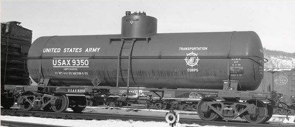 Between 1941 and 1955, the War Department ordered 1,148 10,000 gallon Class ICC-103W tank cars for fuel oil, assigned to the US Army - initially with U.S.
