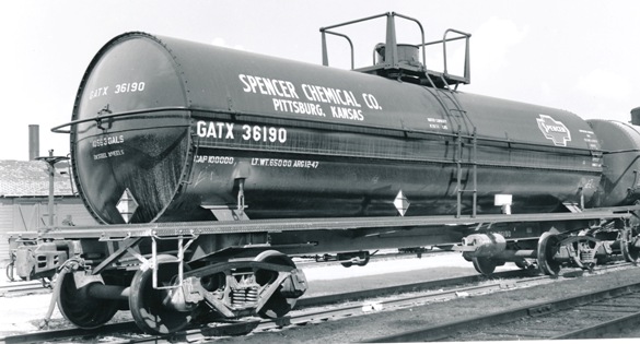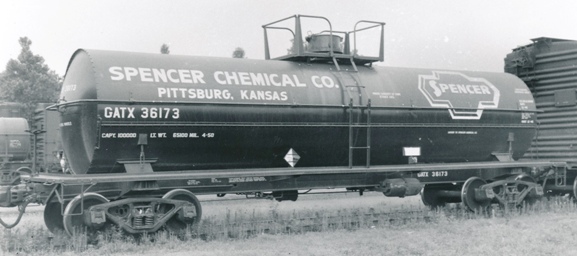 Spencer Chemical owned a few tank cars under it’s reporting marks S.C.J.X., but most were leased from both builders Continental Tank Car Co (RTCX 5351-5400) and General American Transportation Corp (GATX 36170 and 67700 Series). In 1948, Spencer’s owned tank car roster included 20 11,000 Class 105A300W insulated tank cars, as Series 8680-8699, and 40 uninsulated 10,000 gallon Class 103 as Series 9060-9099. By 1958, only the 20 Class 105A cars remained.