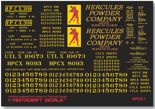 This decal set is designed to enable the modeler to letter a tank car for Hercules Powder Company as seen in various in-service photographs. UTLX and GATX used their lettering style for their leased car reporting marks, and Hercules used as least two distinctive reporting mark lettering styles for their own cars. (Note: GATX reporting marks are not represented in this decal set) Lettering colors used system wide, were as seen on UTLX 10673: yellow and orange lettering with the red devil on a yellow background rectangle.